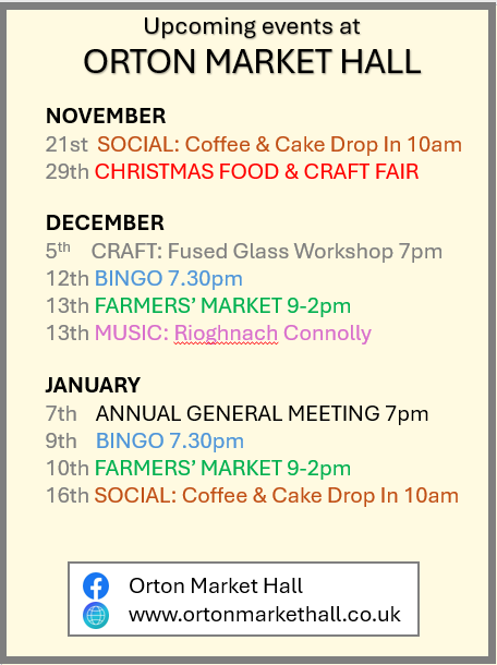 | SATURDAY | ORTON FARMERS MARKET (2nd Sat of the Month) | 9:00-14:00 |